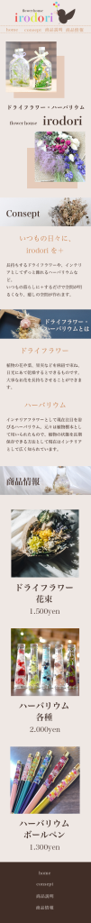ターゲットは20〜30代の女性なので淡く落ち着いた色を選び、お花の画像の色が映えるようにしました。お店のコンセプトやドライフラワー・ハーバリウムの説明を入れ、知らない方でもここで知って頂き、お店に興味を持って足を運んで頂けるようにデザインしました。ロゴはirodoriという名前からロゴとお花はカラフルに映えるようにし、鳥は名前に入っているdoriから取って入れました。「このお店がお客様とお花を繋ぐ架け橋のようになりたい、鳥が幸せを運んで来てくれるモチーフを使用し、お花でお客様に笑顔になって頂きたい」というメッセージを込めて制作しました。