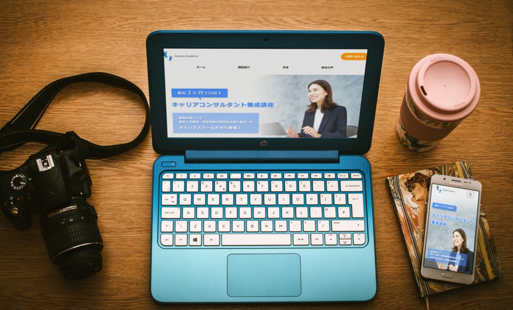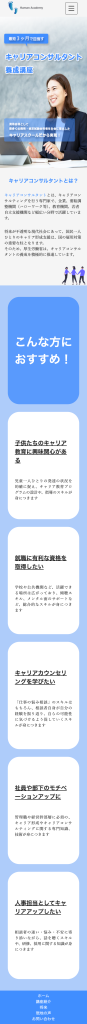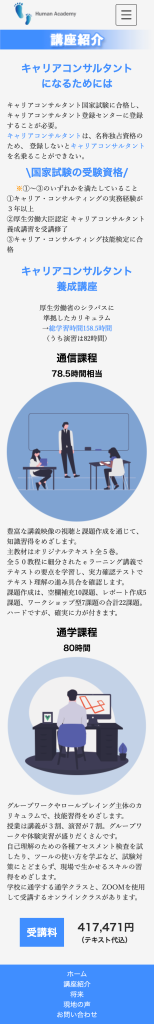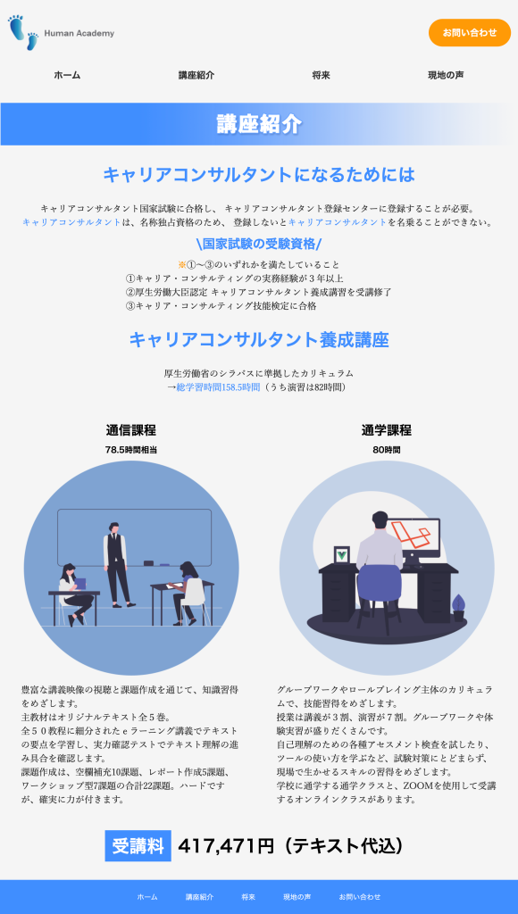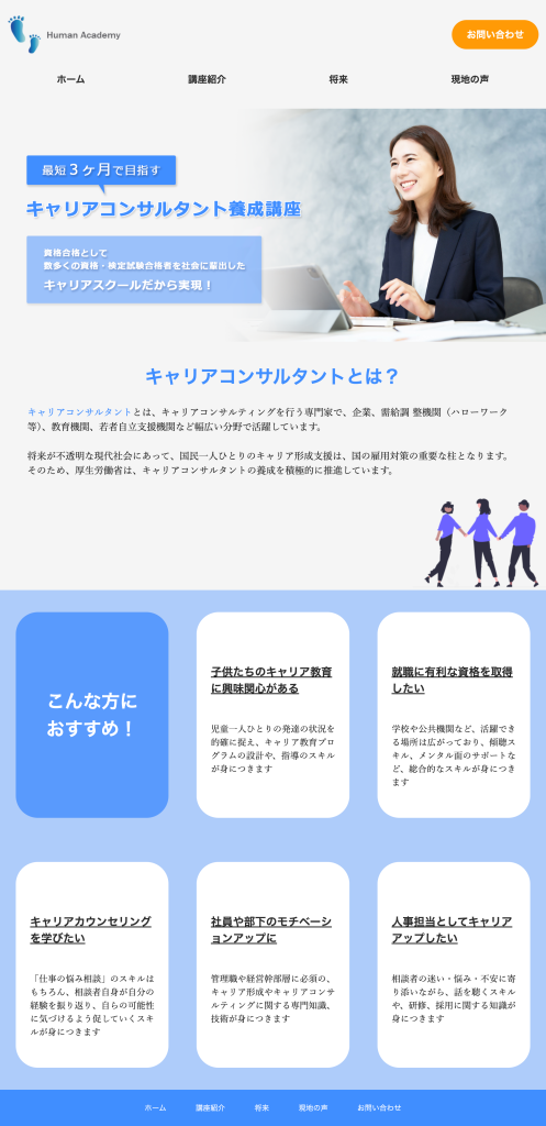 目的が講座に申し込みをして頂くことなので、PCサイトの方は問い合わせボタンを上に出し、アクセントカラーを使用して目立つようにしました。一つ一つのページの情報量を少なめにし、資料請求や無料説明会でより詳しく知って頂く機会を作れたらと思い制作いたしました。ロゴは新しい自分への第一歩、挑戦とヒューマンアカデミーなので人の足跡にサイトの色に合わせたブルーで作成しました。所々にイラストを散りばめ硬すぎず、親しみやすいデザインを意識しました。